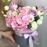 Шляпная коробка с гортензией, розами и лизуантусами | Купить в Фукуоке