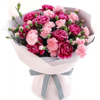 Красочный букет состоящий из обычной и кустовой гвоздики, в красивой и стильной упаковке