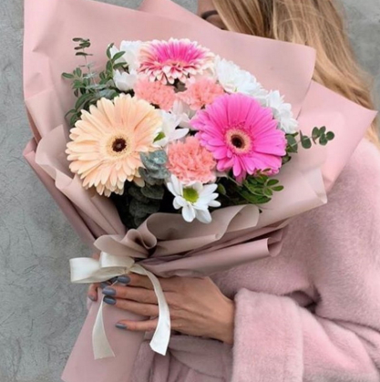 Букет из гербер, хризантем и диантусов с добавлением фисташки и эвкалипта в стильной упаковке