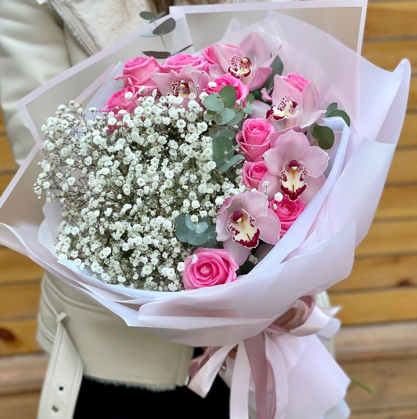 Красивый букет из орхидей, роз и гипсофилы в стильном оформлении