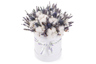 Потрясающее сочетание нежных эустом, пионовидных роз и диантусов с добавлением гиперикума и эвкалипта
