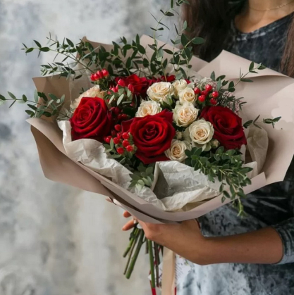 Букет состоит из красных роз, которые являются символом страсти и любви, а также кремовых кустовых роз, которые придают ему изящность и нежность. Дополнительно в букете использован гиперикум, маленькие красные ягоды, они придают цветочной композиции игривый и живописный акцент.