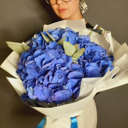 Три синие гортензии в упаковке | Delaflor в Фукуоке