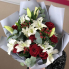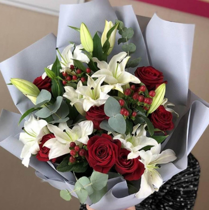 Букет среднего размера, сочетаюший в себе белые лилии, красный гиперикум и розы.