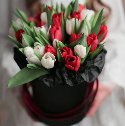 Шляпная коробочка с белыми и красными тюльпанами, украшенная тишью.