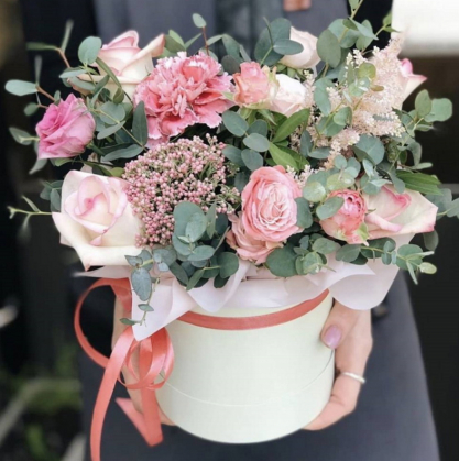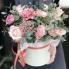 Шляпная коробочка с одиночными и кустовыми розами, гвоздикой и озотамнусом, с добавлением астильбы и эвкалипта