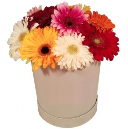 Микс из разноцветных гербер в шляпной коробке. Количество гербер зависит от размера коробки. Так размер стандарт: 11-19 гербер.
