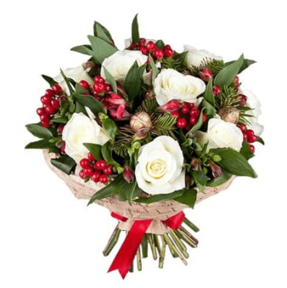 Новогодняя композиция из роз, гиперикума и альстромерий.