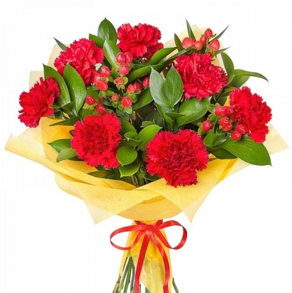 Очень яркий букет из гвоздики и гиперикума с добавлением рускуса