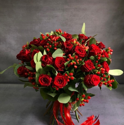 Стильная композиция с розами и гиперикумом "Страстный вечер"