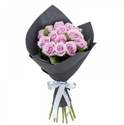 Букет из 15 сиреневых роз в черном крафте | Купить в Фукуоке
