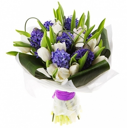 Нежный букет, сочетающий ароматные гиацинты, тюльпаны с добавлением зелени аспидистры.