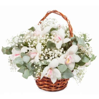 Небольшая корзиночка с орхидеями, украшенная гипсофилой и зеленью из эвкалипта. Очень красивая композиция.
