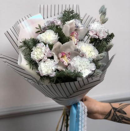 Чудесный букет из веток нобилиса с добавлением орхидеи и белых диантусов.